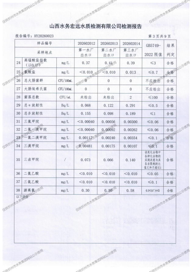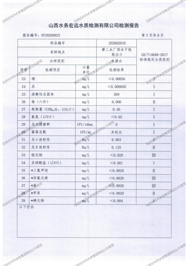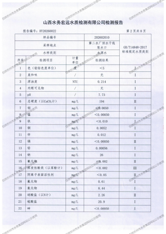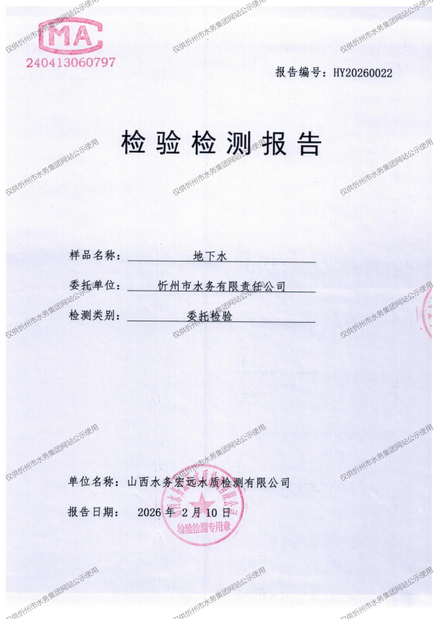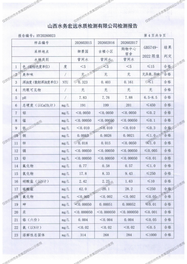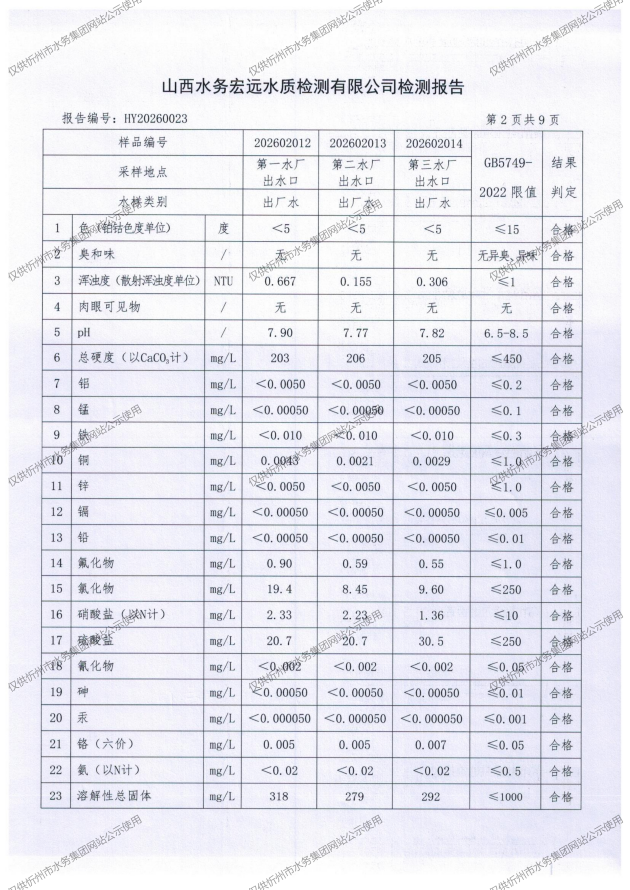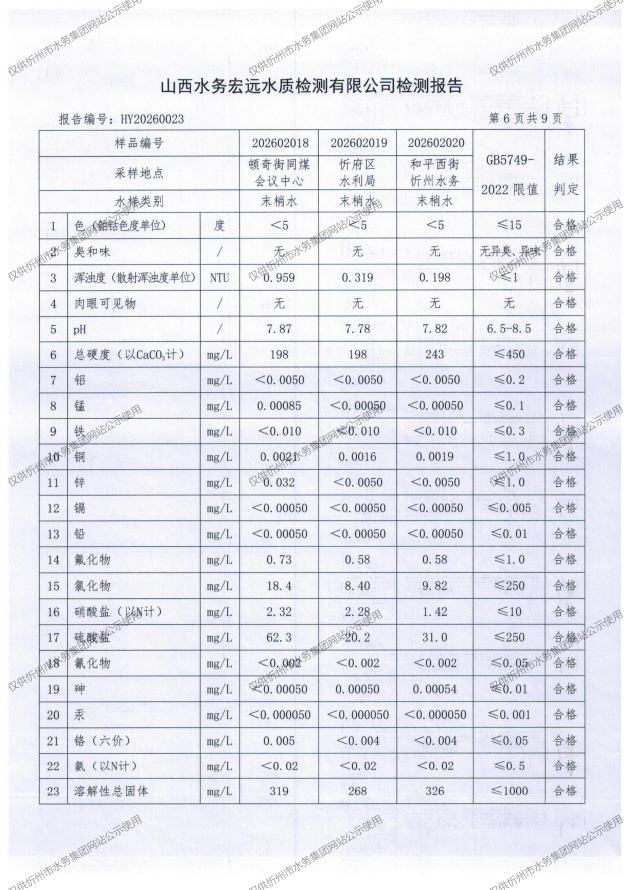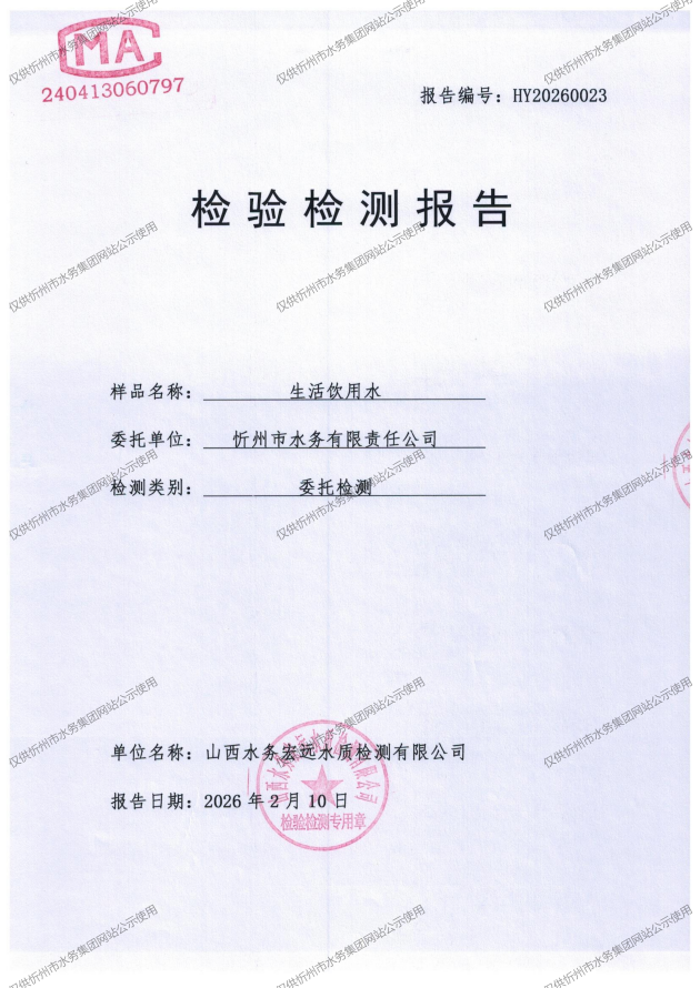 忻州城區(qū)公共供水水源水、出廠水、管網水、管網末梢水2026年2月份水質信息公示