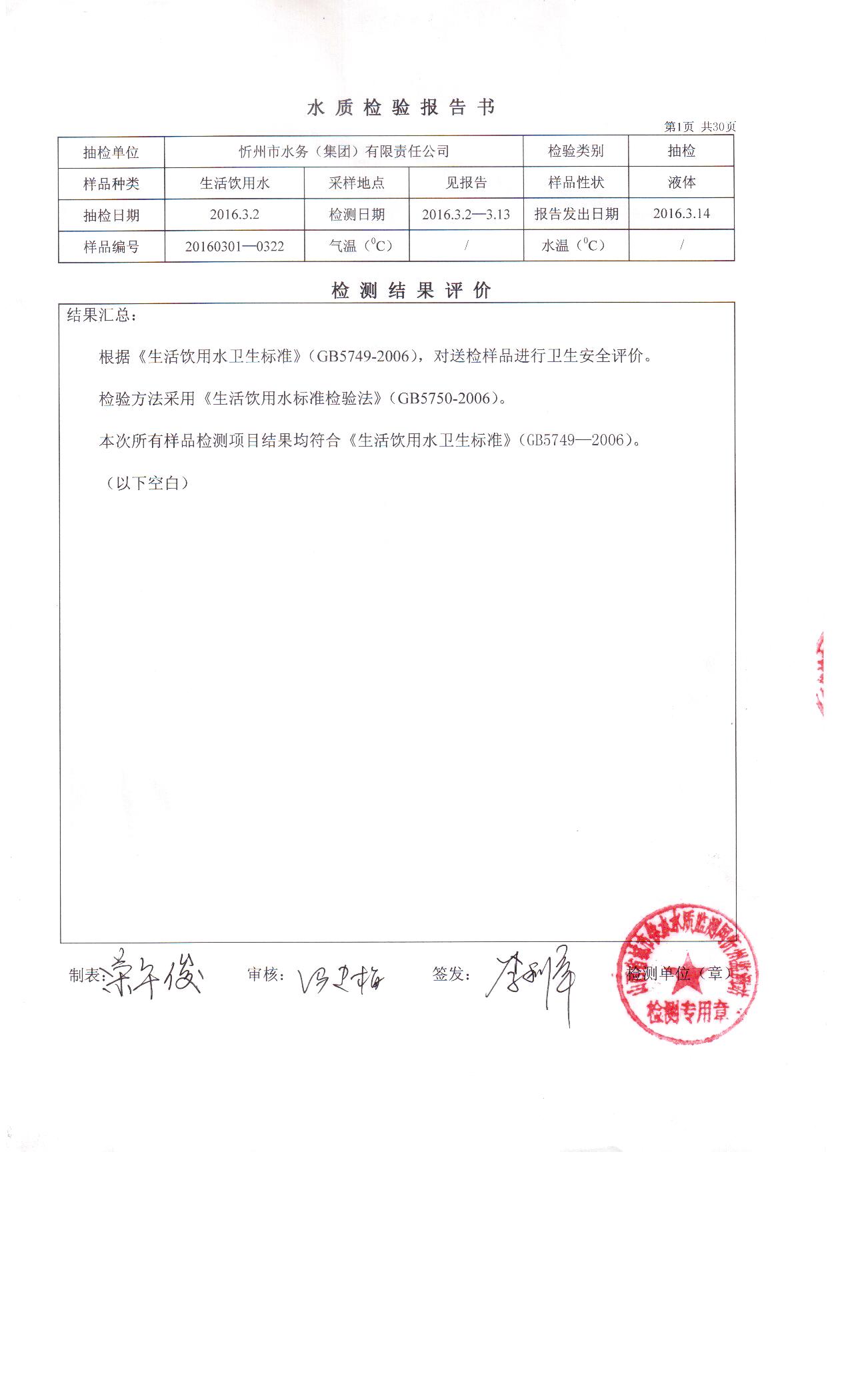 忻州城區公共供水2016年第一季度生活飲用水水質信息
