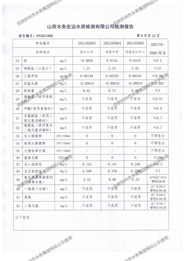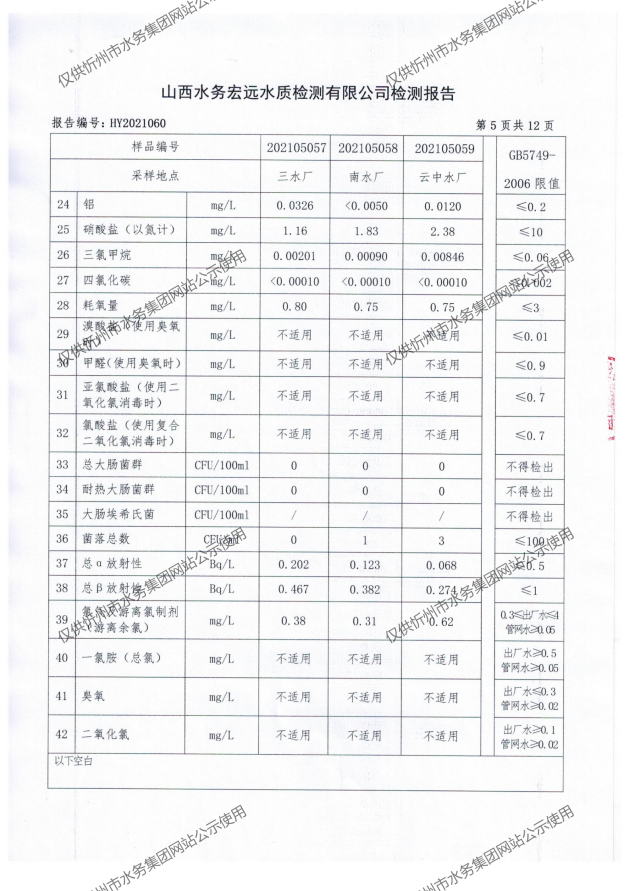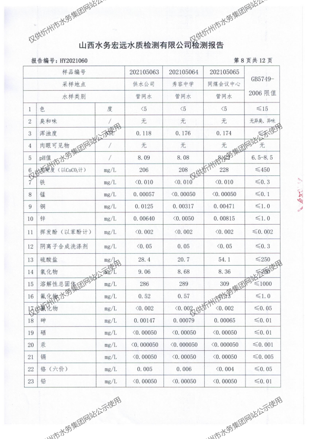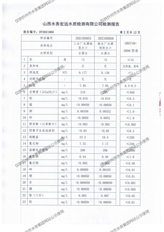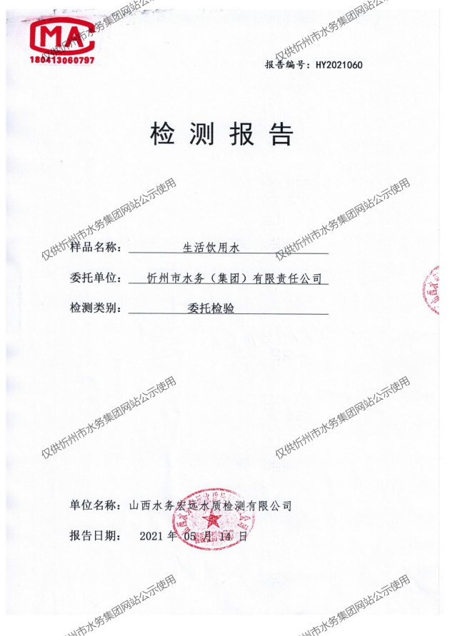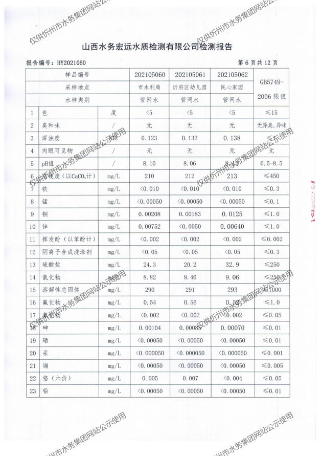 忻州城區公共供水水源水、出廠水、管網水、管網末梢水2021年5月份水質信息公示